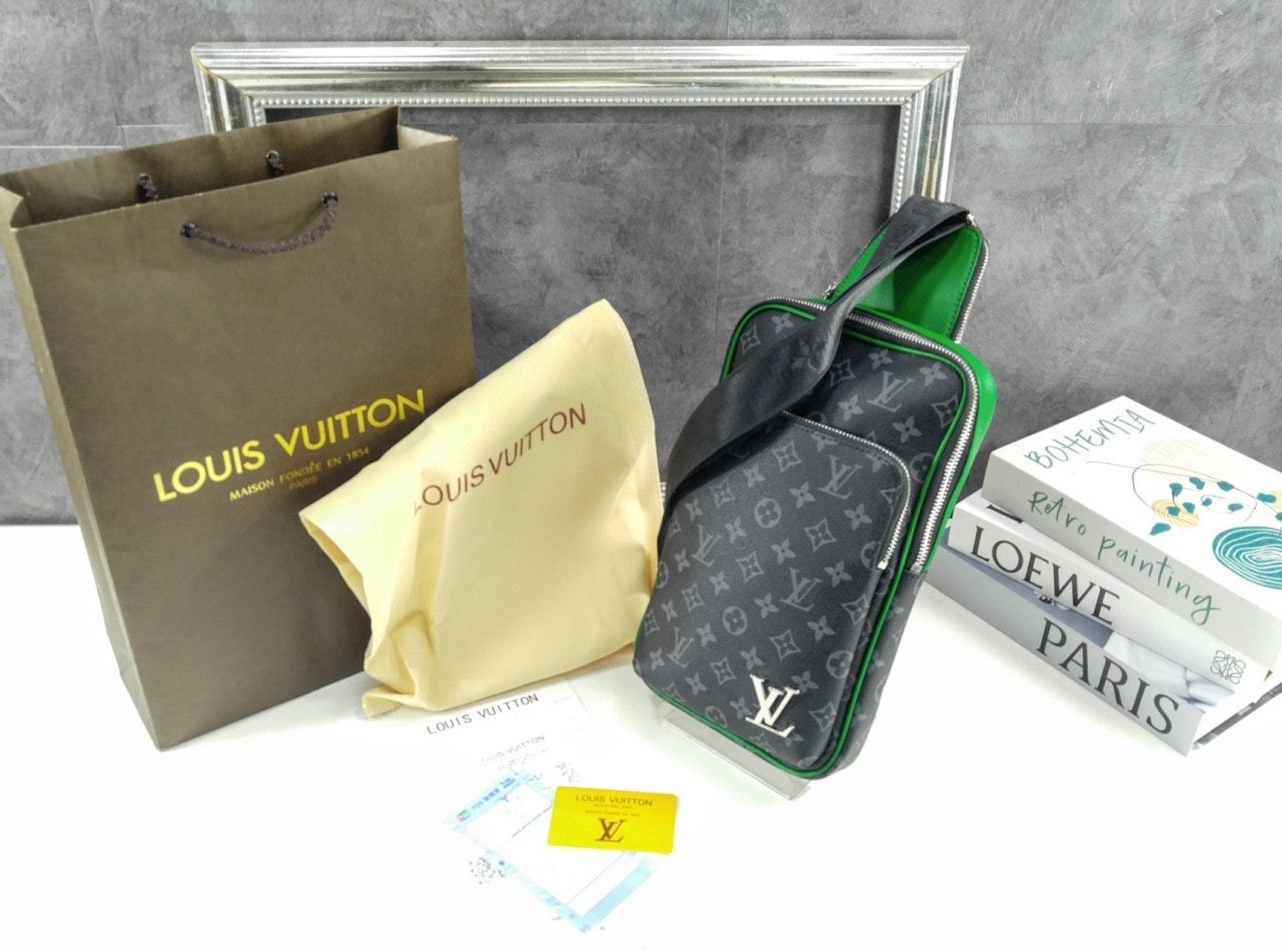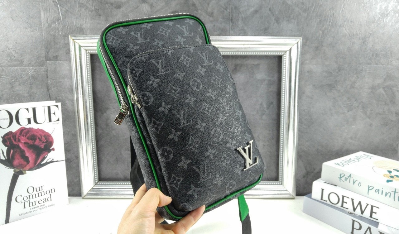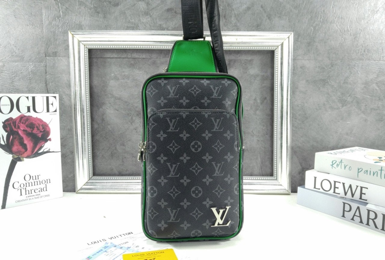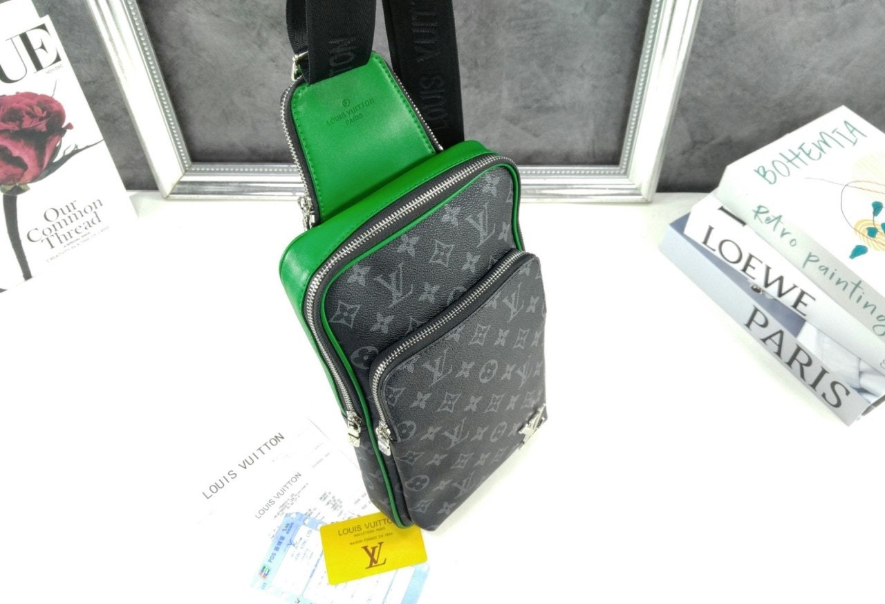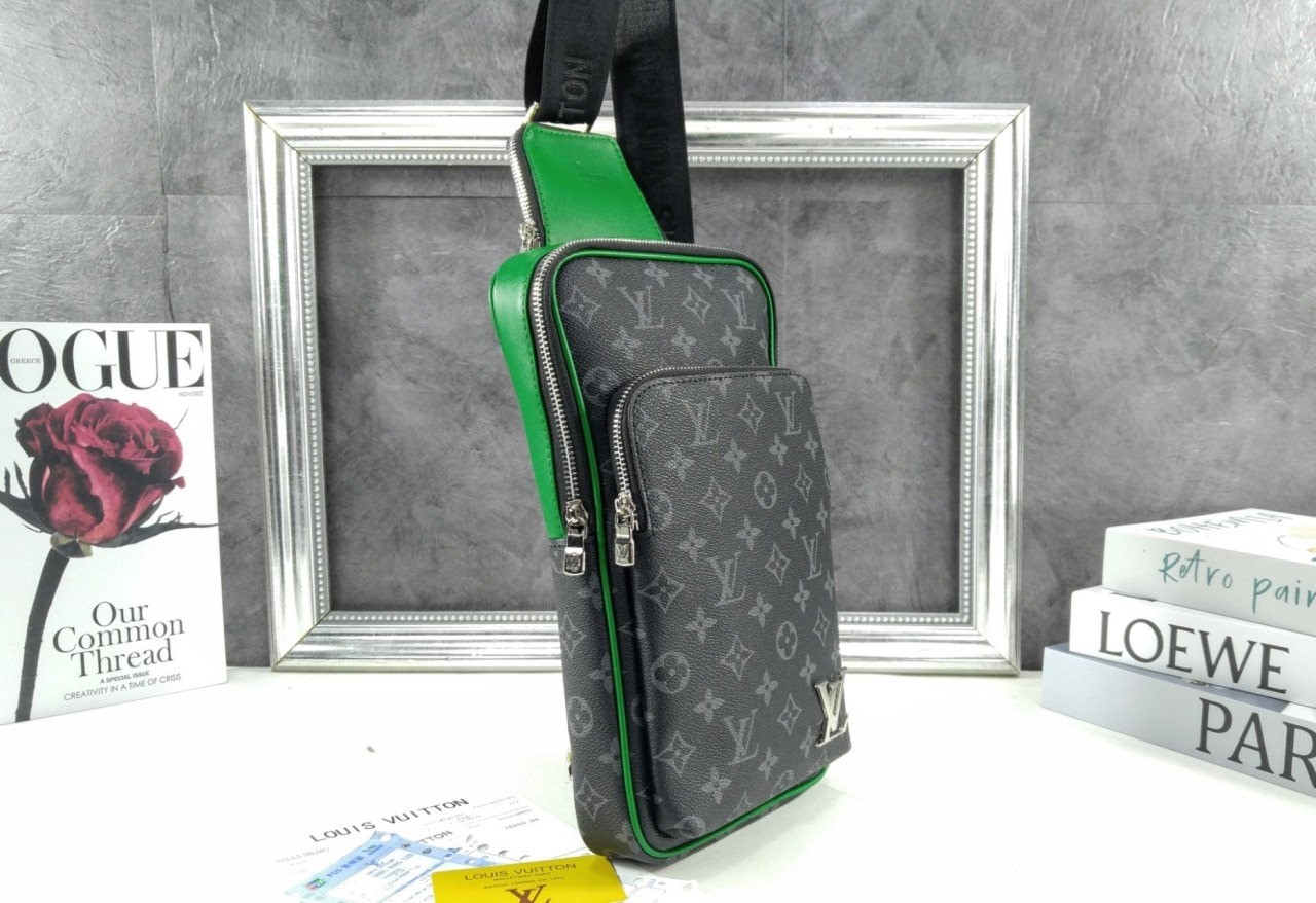 모노그램 이클립스 캔버스 소재의 에비뉴 슬링백 PM 크로스바디 백. 대담하고 산뜻한 감각을 더하는 색상을 입힌 가죽 트리밍과 파이핑 디테일. 루테늄 색조의 지퍼가 달린 세 개의 지퍼형 포켓과 주요 수납칸, 넓은 앞면 포켓, 작은 삼각 포켓을 갖춘 아이템.